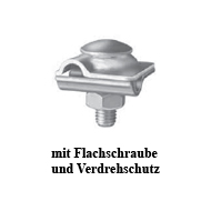 100147 | Stahl verzinkt, 2-teilig, rund/rund Klemmbereich Ø 8 – 10 mm, M10 mit Flachschraube und Verdrehschutz | 50 Stück | 5,20 kg Karton |