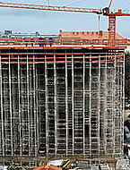 Das Fallkopfsystem ermöglicht das Ausschalen bereits zwei Tage nach dem Betonieren ohne Entlastung der Stützen. Dabei werden sofort sämtliche Haupt- und Nebenträger frei, die dann im nächsten Bauabschnitt wieder eingesetzt werden können.